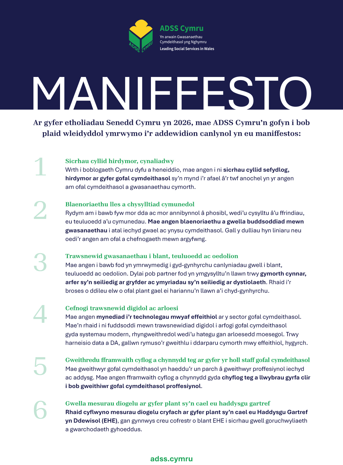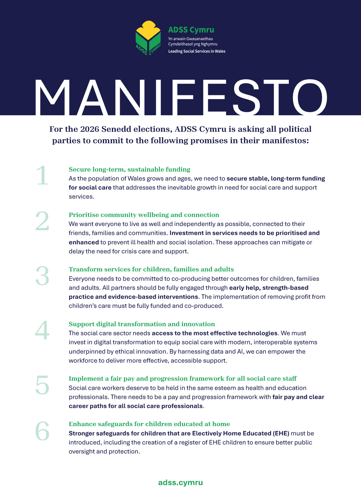Alongside this document, we have published our manifesto which calls on all political parties to commit to six key promises in the 2026 Senedd Elections.